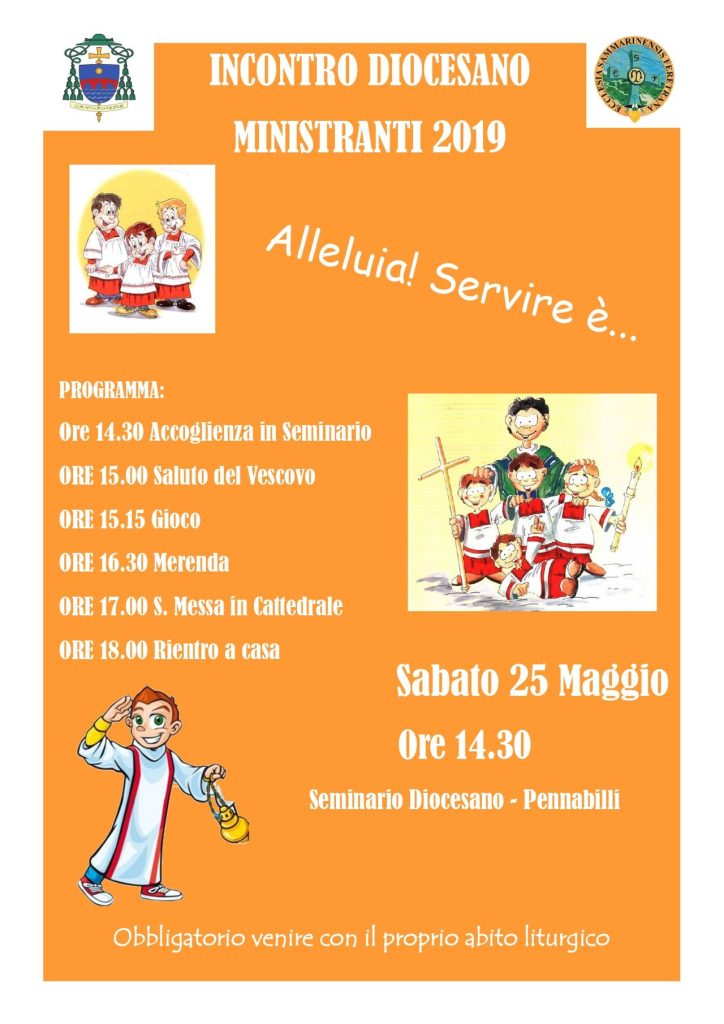 Sabato 25 maggio dalle ore 14:30 presso il Seminario vescovile di Pennabilli si terrà l'incontro diocesano dei ministranti. Alle ore 17 il Vescovo Andrea presiederà la Santa Messa nella Cattedrale
