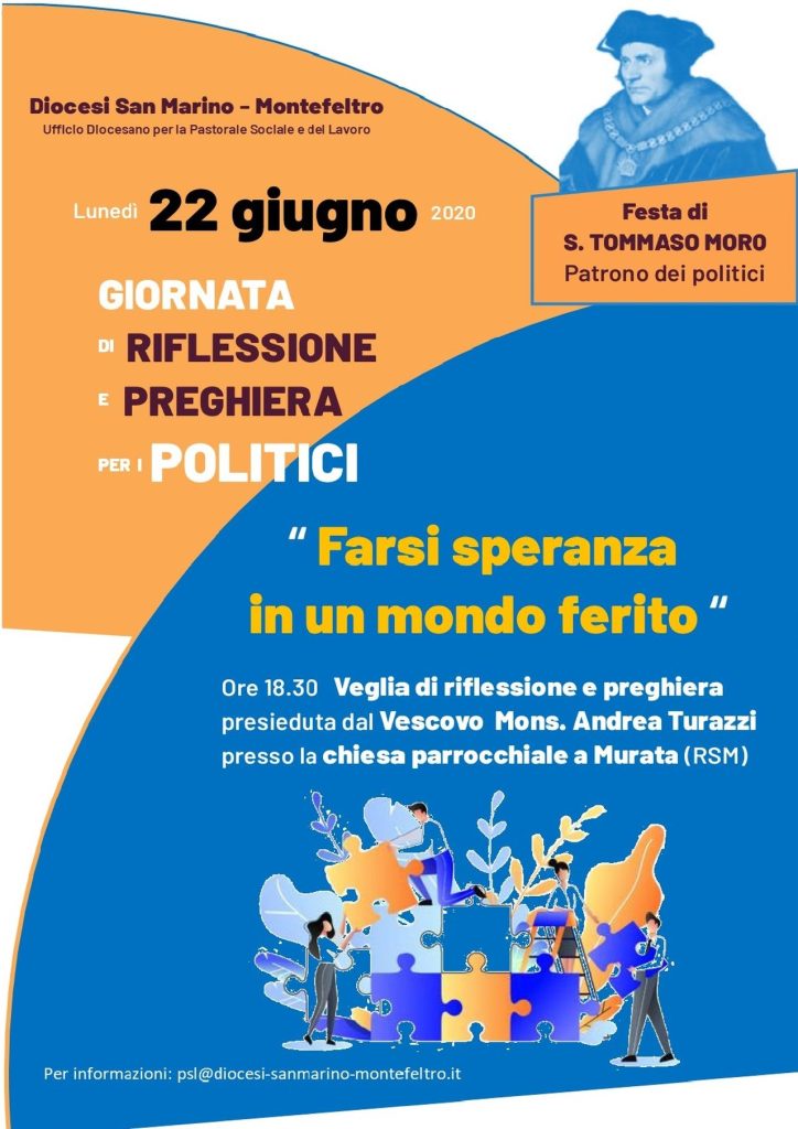 Lunedì 22 giugno ricorre la memoria di san Tommaso Moro, patrono dei politici. Dopo qualche esitazione a motivo della pandemia, la Commissione di Pastorale Sociale e del Lavoro della Diocesi di San Marino-Montefeltro ha confermato l’invito ai sindaci, ai dirigenti scolastici e a tutte le persone impegnate in politica (sammarinesi e italiane) ad un incontro di riflessione e di preghiera. “Si tratta – scrive il Vescovo Mons. Andrea Turazzi – di una Veglia dalle ore 18:30 alle ore 20 nella chiesa dei Santi Pietro, Marino e Leone di Murata (RSM) così organizzata: la prima parte della Veglia consisterà nella meditazione di alcuni passaggi del memorabile discorso tenuto da papa Francesco il 27 marzo in piazza San Pietro, in solitudine ma attorniato da milioni di cuori. Seguirà un rilancio della Lettera Enciclica “Laudato si’”, con particolare riferimento ai temi di un’ ecologia integrale e di un’economia sostenibile. L’incontro è stato preparato con impegno e competenza dalla Commissione diocesana per la Pastorale Sociale e del Lavoro che lancia questo appello: <Farsi speranza in un mondo ferito>.