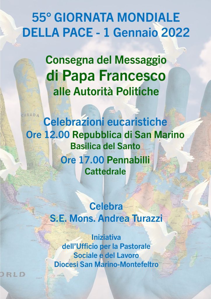 L'Ufficio di Pastorale Sociale e del Lavoro organizza per il 1° gennaio la Consegna del Messaggio della Pace di papa Francesco alle Autorità in Basilica del Santo a San Marino Città (RSM) alle ore 12 e in Cattedrale a Pennabilli alle ore 17. Presiede le celebrazioni eucaristiche il Vescovo Andrea