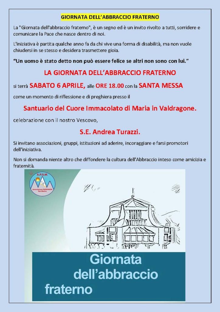 L'Associazione Parkinsoniani Sammarinesi organizza la "Giornata dell'abbraccio fraterno" sabato 6 aprile. Alle ore 18 si terrà una celebrazione eucaristica come momento di riflessione e di preghiera presso il Santuario del Cuore Immacolato di Maria in Valdragone. Sono invitate tutte le associazioni del territorio