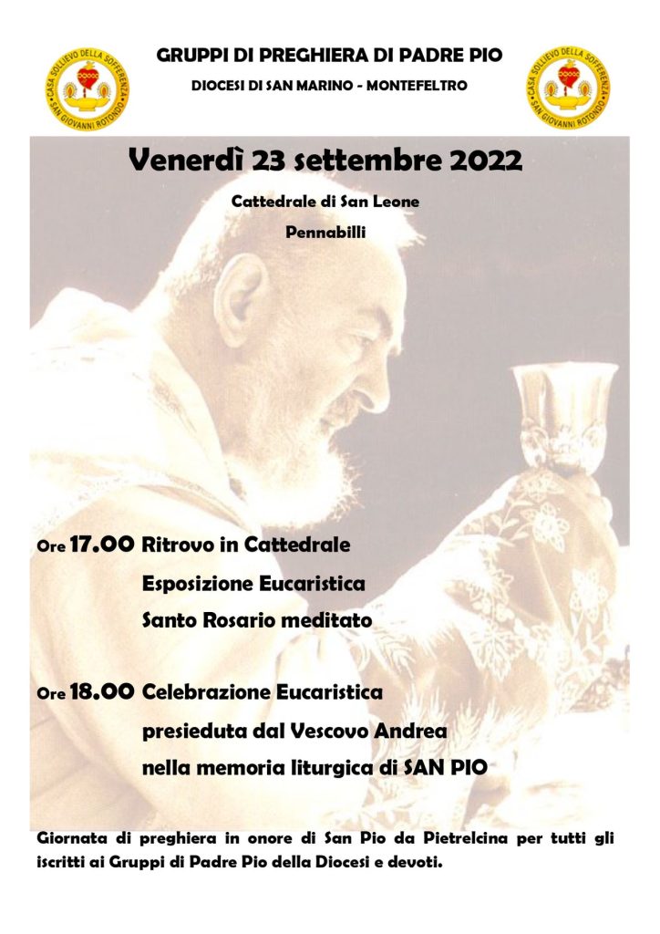 Venerdì 23 settembre, in occasione della festa liturgica di San Pio da Pietrelcina, dalle ore 17 nella Cattedrale di Pennabilli si terrà un pomeriggio di preghiera con tutti i gruppi di Padre Pio della Diocesi. Alle ore 18 il Vescovo Andrea presiederà la celebrazione eucaristica
