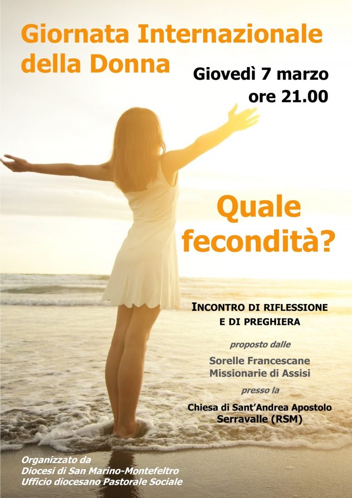 Giovedì 7 marzo ore 21 presso la chiesa parrocchiale di Serravalle si terrà un incontro di riflessione e preghiera, organizzato dall'Ufficio diocesano di Pastorale Sociale, per la GIORNATA INTERNAZIONALE DELLA DONNA dal titolo: «Quale fecondità?»