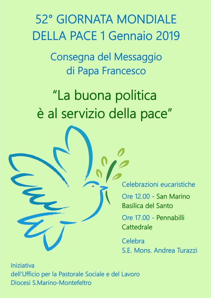 1 gennaio 2019 Giornata Mondiale della Pace: "La buona politica è al servizio della pace". Celebrazioni eucaristiche alle ore 12 a San Marino (Basilica del Santo) e alle ore 17 a Pennabilli (Santuario B. V. delle Grazie). Presiede il Vescovo Andrea