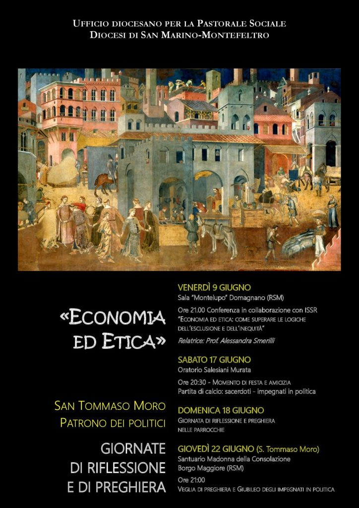 Giovedì 9 giugno ore 21 alla Sala Montelupo di Domagnano si terrà una conferenza nell'ambito delle Giornate di riflessione e di preghiera per gli impegnati in politica dal titolo: "Economia ed etica: come superare le logiche dell'esclusione e dell'inequità. Sabato 17 giugno a Murata: partita politici vs sacerdoti. Giovedì 22 giugno ore 21 a Borgo Maggiore: Veglia di preghiera e Giubileo dei politici