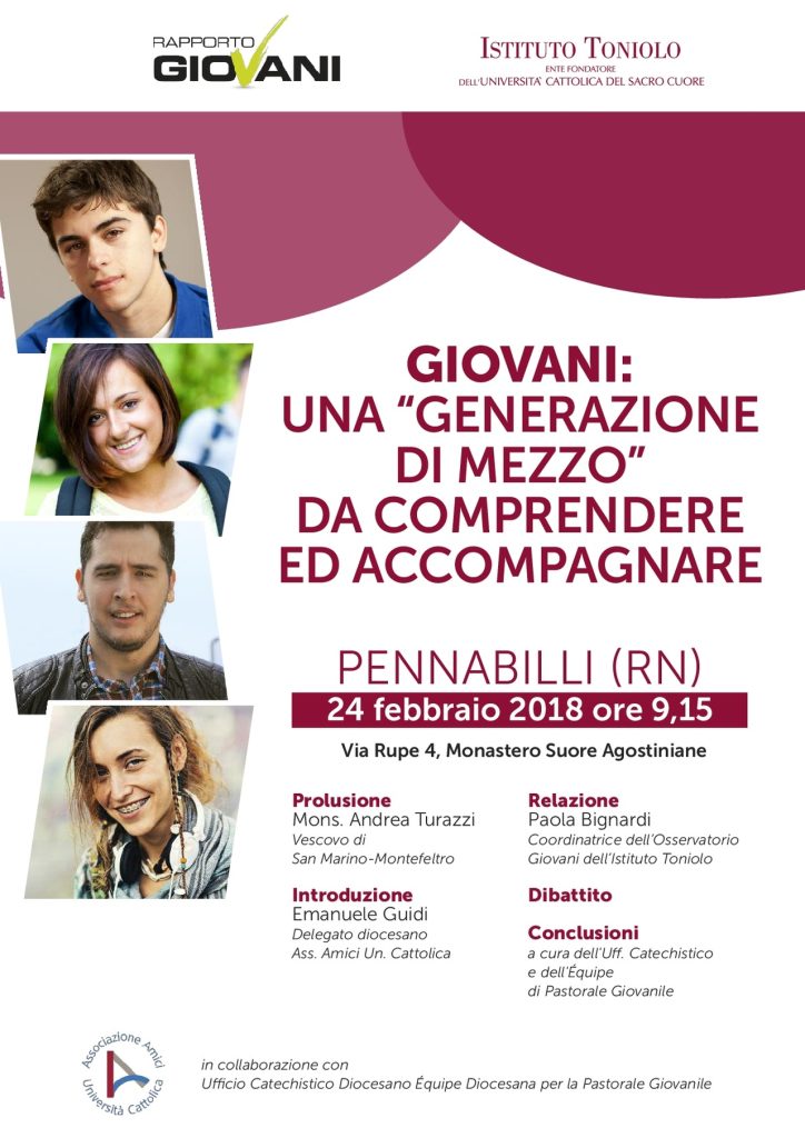 Sabato 24 febbraio alle ore 9:15 conferenza-dibattito organizzata dall'Associazione Amici dell'Università Cattolica insieme all'Ufficio catechistico e all'Ufficio di Pastorale giovanile sul tema: "Giovani: una "generazione di mezzo" da comprendere ed accompagnare"