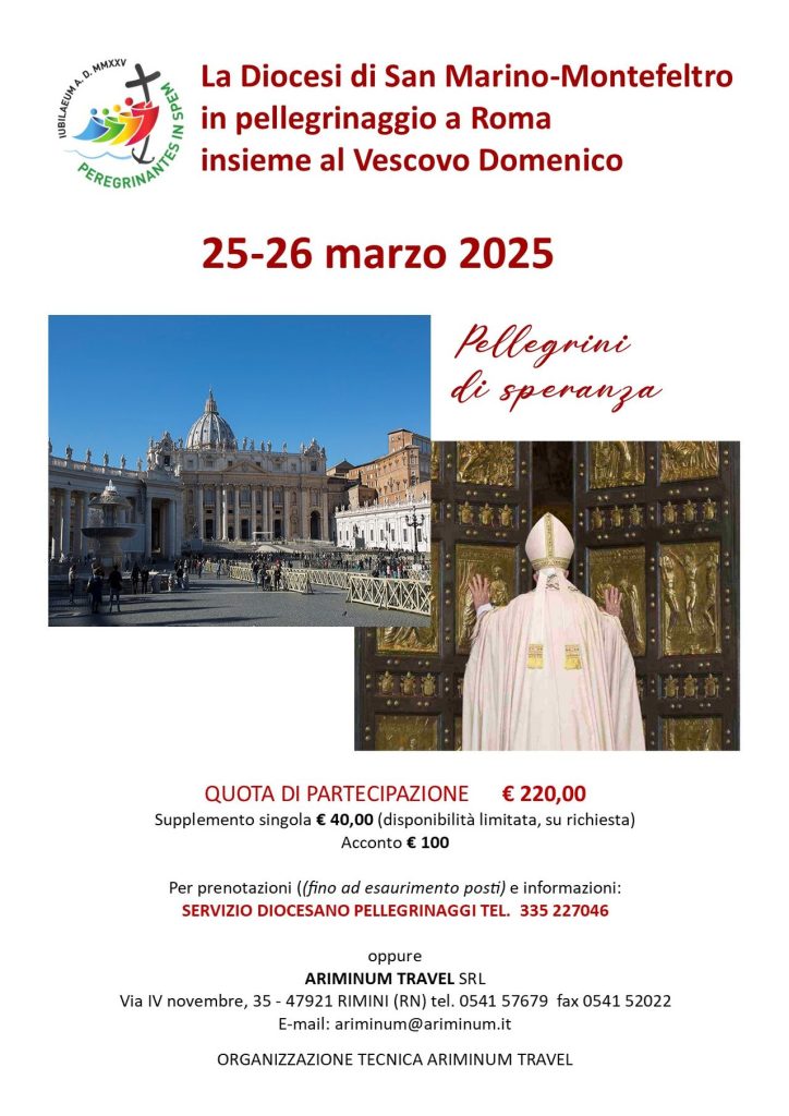 Avremo la gioia di poter vivere come Diocesi un pellegrinaggio unitario a Roma: martedì 25 e mercoledì 26 marzo 2025. In questo Giubileo 2025, infatti, saranno aperte le Porte Sante solo nelle quattro Basiliche Maggiori di Roma (S. Pietro, S. Giovanni in Laterano, S. Maria Maggiore e S. Paolo fuori le mura) e in un carcere che Papa Francesco sceglierà come segno di speranza per tutti i detenuti.