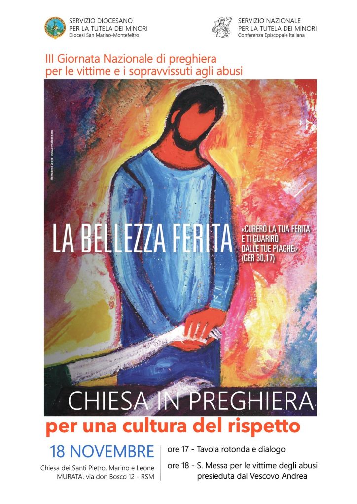 A livello diocesano, con invito esteso a tutti, ci riuniremo nella chiesa dei Santi Pietro, Marino e Leone (via don Bosco, 12 – Murata RSM) per un momento unitario: ore 17 Tavola rotonda con la presenza del Vicario Generale, don Mirco Cesarini, e del dottor Piero Manocchio, Referente diocesano del Servizio Tutela Minori, sul tema della Giornata: “La bellezza ferita” e per fare il punto della situazione; ore 18 Santa Messa per le vittime e i sopravvissuti agli abusi.