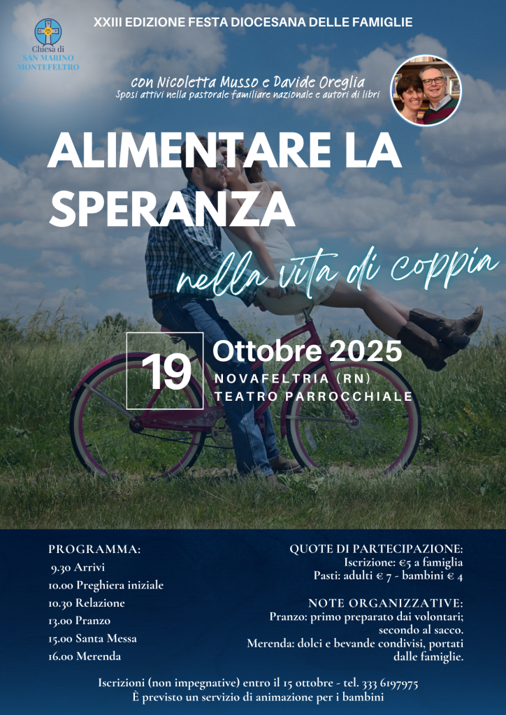 Quest’anno si terrà domenica 19 ottobre nel teatro parrocchiale di Novafeltria. La giornata, giunta alla sua XXIII edizione, inizierà alle ore 9.30 con un momento di preghiera cui seguirà la relazione dei coniugi Musso e Oreglia dal titolo “Alimentare la speranza nella vita di coppia” argomento in sintonia con il tema dell’Anno giubilare.