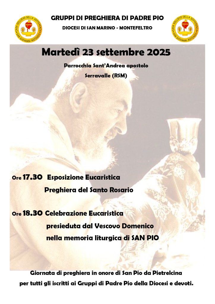 Martedì 23 settembre, memoria liturgia di San Pio da Pietrelcina, tutti i gruppi di preghiera in Diocesi e i devoti di padre Pio si incontreranno nella parrocchia di Sant’Andrea Apostolo in Serravalle (RSM) per un momento di preghiera e celebrazione.