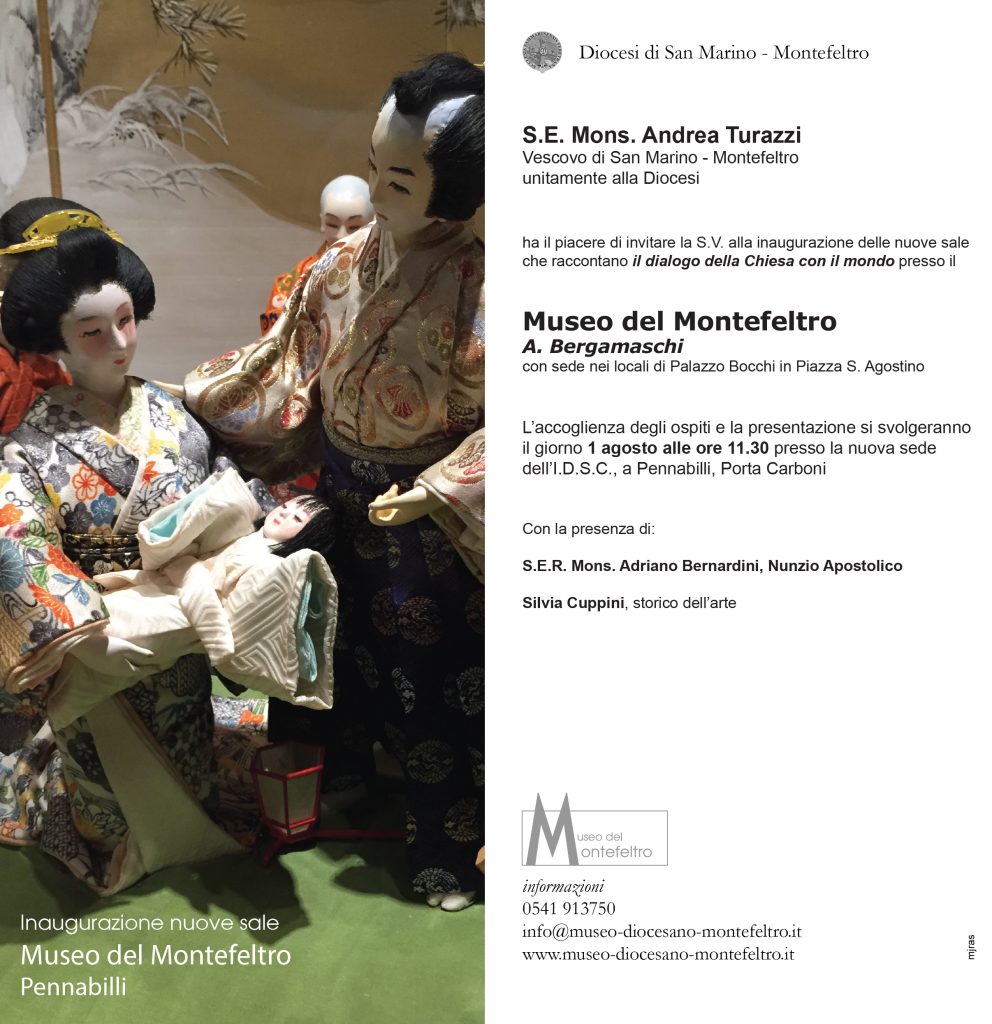 S.E. Mons. Andrea Turazzi ha il piacere di invitare alla inaugurazione delle nuove sale che raccontano il DIALOGO DELLA CHIESA CON IL MONDO presso il Museo del Montefeltro “A. Bergamaschi” con sede nei locali di Palazzo Bocchi (Pennabilli, p.zza Sant’Agostino).