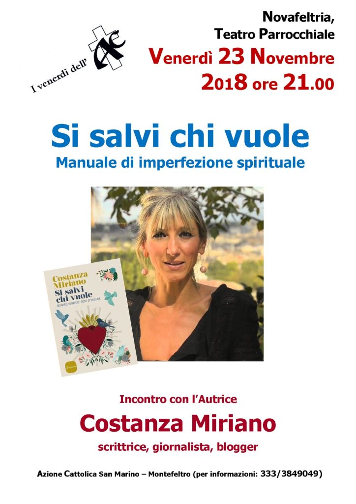 Per I Venerdì dell'AC il 23 novembre alle ore 21 presso il teatro parrocchiale di Novafeltria si terrà un incontro con la scrittrice, giornalista e blogger Costanza Miriano dal titolo: «Si salvi chi vuole. Manuale di imperfezione spirituale».