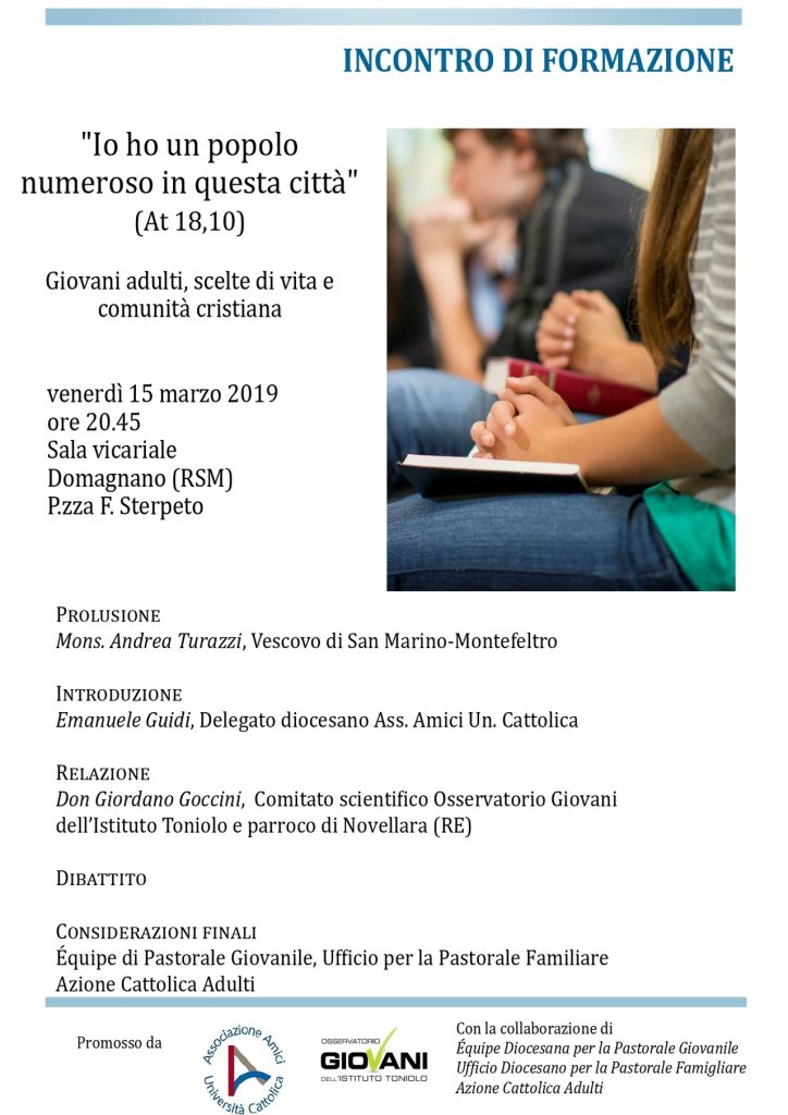 Venerdì 15 marzo ore 20:45 presso la Sala vicariale di Domagnano (RSM) si terrà un INCONTRO DI FORMAZIONE organizzato dall'Associazione Amici Università Cattolica insieme all'Ufficio Famiglia e all'Ufficio di Pastorale Giovanile: "Io ho un popolo numeroso in questa città". Relatore: don Giordano Goccini (Comitato scientifico Osservatorio Giovani dell'Istituto Toniolo)