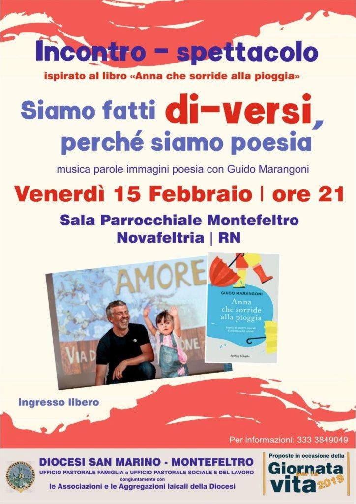 Venerdì 15 febbraio ore 21 presso la Sala parrocchiale di Novafeltria si terrà un incontro-spettacolo dal titolo: "Siamo fatti di-versi perchè siamo poesia": musica, parole, immagini, poesia con Guido Marangoni. Ingresso libero