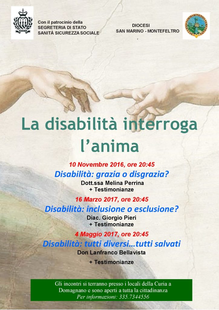 Giovedì 4 maggio alle ore 21 presso la Sala della Curia a Domagnano ultimo incontro del ciclo di incontri organizzato dalla Pastorale della Salute dal titolo: "La disabilità interroga l'anima"