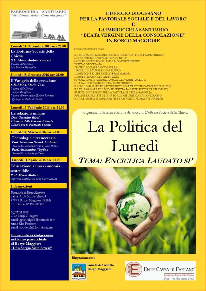 -Dal 14 dicembre ore 21 a Borgo Maggiore inizierà la terza edizione della "Politica del Lunedì" sul tema dell'Enciclica di Papa Francesco: Laudato si'