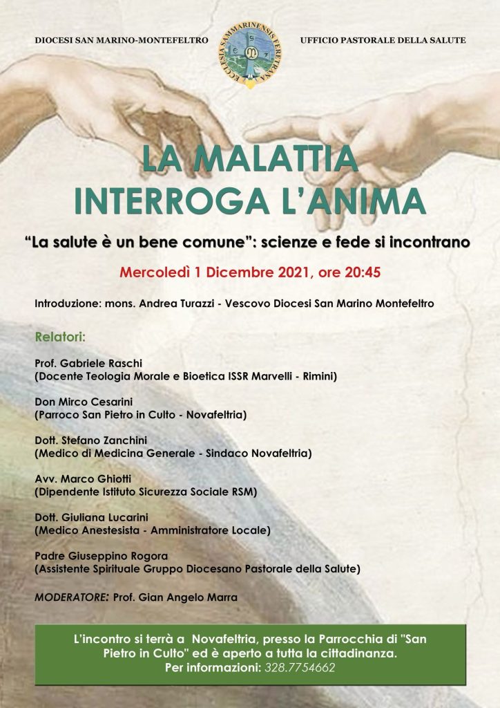 Nel ricordo di San Luca, patrono dei medici e di tutti gli operatori sanitari, l’Ufficio Pastorale della Sanità della Diocesi di San Marino-Montefeltro ha promosso una tavola rotonda che ha visto riuniti amministratori, personale sanitario e operatori pastorali. Tra i partecipanti don Mirco Cesarini, parroco di Novafeltria, Stefano Zanchini e Giuliana Lucarini, rispettivamente sindaco di Novafeltria e vice-sindaco di Pennabilli, l’avvocato Marco Ghiotti, amministratore dell’Istituto Superiore della sanità della Repubblica di San Marino e Gabriele Raschi, docente di teologia morale dell’Università Carlo Bo di Urbino. L’incontro è stato moderato da Gian Angelo Marra, coordinatore diocesano dell’Ufficio Pastorale della Sanità. Una prima riflessione di S.E. il vescovo mons. Andrea Turazzi ha evidenziato la necessità che la salvaguardia della vita umana e la prevenzione di ogni forma di malattia, che rischi di coinvolgere chi ci è accanto o condivide con noi luoghi e ambienti, richiedono una comune azione di fede e scienza. Nel trattamento terapeutico occorre incontrarsi sul terreno dell’umano perché l’area di confronto tra antropologie differenti non sta nella disputa teoretica, ma nella ricerca di comportamenti condivisibili.