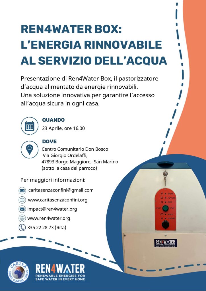 Acqua sicura per tutti: è l’obiettivo del nuovo progetto REN4WATER BOX che sarà presentato mercoledì 23 aprile, alle 16, presso il Centro Comunitario Don Bosco, della Parrocchia di Borgo Maggiore, per iniziativa dell’Associazione Carità senza Confini. Si tratta della prima mini-serie del Water-Box per pastorizzare e rendere sicura l’acqua in quei contesti vulnerabili che ne sono privi, perché le risorse idriche sono scarse o compromesse da contaminazioni e da inquinamento delle falde.
