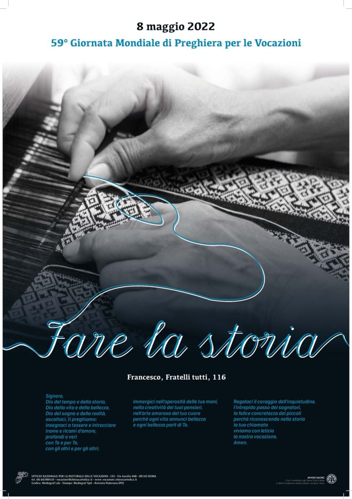 Alla preghiera per le vocazioni è specialmente dedicata la IV domenica di Pasqua, detta “del buon pastore”, quest’anno domenica 8 maggio. Raccomando che si facciano preghiere in ogni parrocchia, chiesa e comunità della Diocesi. Tema della Giornata è: “Fare la storia” (FT 116). «La vocazione – come la storia – si fa; è un’opera artigianale che non può compiersi che alla scuola del Maestro e insieme alla Chiesa».