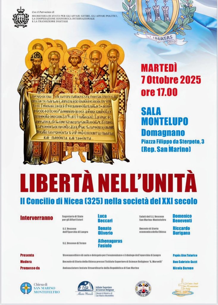 Martedì 7 ottobre alle ore 17 si terrà presso la Sala Montelupo di Domagnano (Piazza Filippo da Sterpeto 3 – RSM) il Convegno “Libertà nell’unità. Il Concilio di Nicea (325) nella società del XXI secolo”.