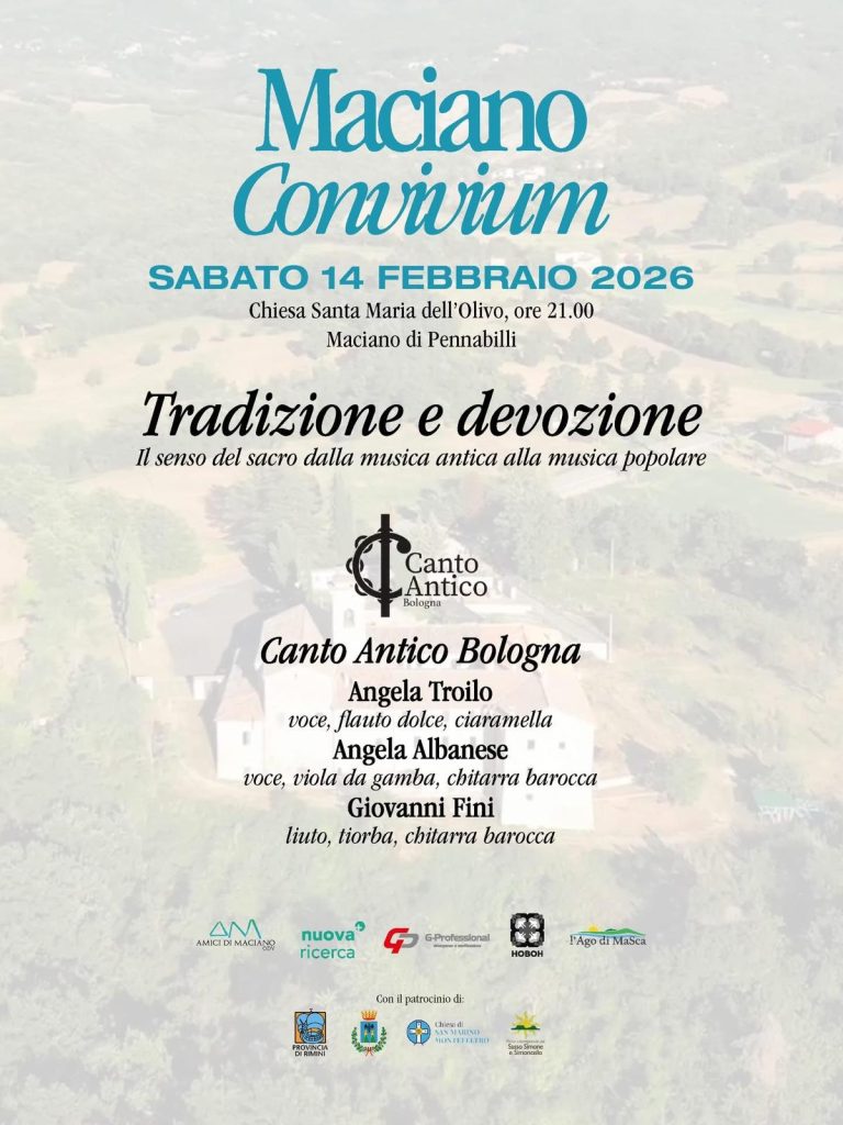 Maciano Convivium vi aspetta sabato 14 febbraio alle ore 21 presso la chiesa del Convento di Santa Maria dell’Olivo a Maciano di Pennabilli (RN) con Canto Antico Bologna.