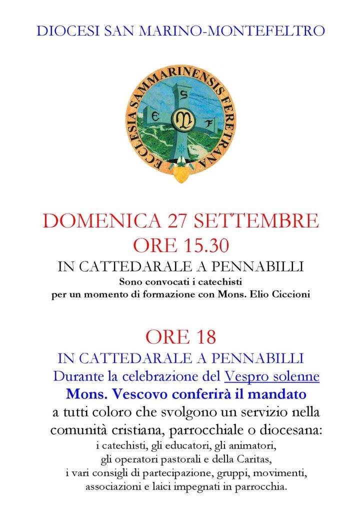 -Domenica 27 settembre ore 18 in Cattedrale a Pennabilli Vespro solenne con "Mandato" agli operatori pastorali