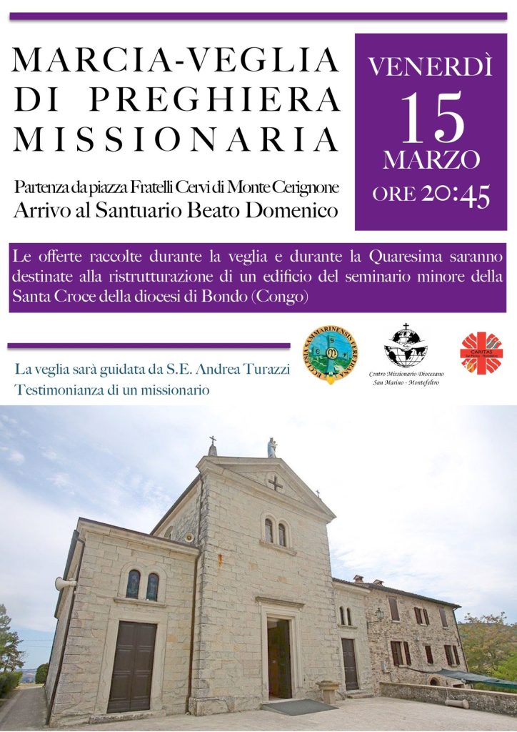 Venerdì 15 marzo alle ore 20:45 si terrà la Marcia-Veglia diocesana di preghiera missionaria con partenza dalla piazza di Monte Cerignone (p.zza Fratelli Cervi) e arrivo al Santuario del Beato Domenico Spadafora. La Veglia sarà presieduta dal Vescovo Andrea e, all'arrivo al Santuario, è prevista la testimonianza di un missionario. Le offerte raccolte durante la serata saranno destinate al progetto "Adotta un Seminario"