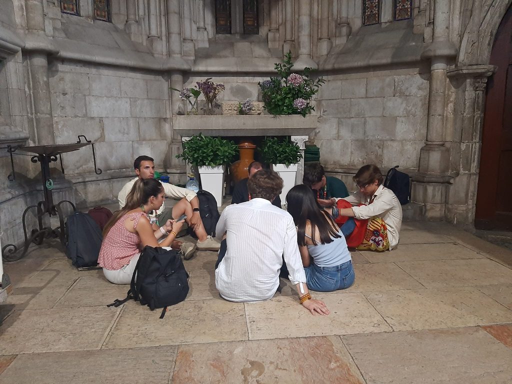 La prima giornata è caratterizzata dagli incontri decentrati di catechesi. Sono a disposizione. Mi mandano ad incontrare giovani di due Diocesi, in tutto oltre 250. È decisamente superato lo stile frontale della lezione: è arrivato anche qui il metodo della “conversazione spirituale”. Si procede così: apertura con un intenso momento di preghiera e divisione in piccoli gruppi, se possibile all’aperto; un animatore, seguendo schede appositamente preparate, ha il compito di facilitare lo scambio dei pensieri e un altro giovane ha il compito della sintesi e, con la collaborazione di tutti, della stesura di una domanda da rivolgere al vescovo catechista. È un incontro diretto. Ho la fortuna di avere come collega il vescovo di Concordia-Pordenone (mons. Giuseppe Pellegrini): nasce una bella amicizia. Ha partecipato a tante GMG, anche da organizzatore: si lavora insieme.
