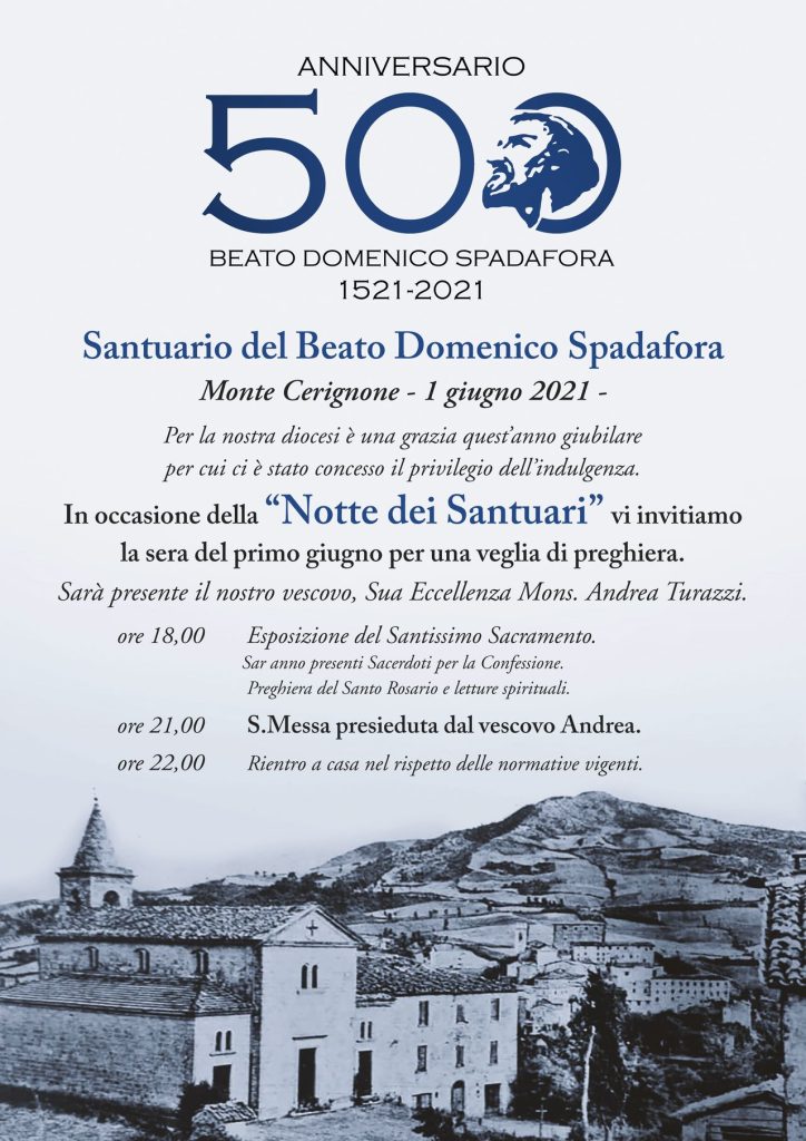 La sera tra l'1 e il 2 giugno si terrà nel Santuario del Beato Domenico di Monte Cerignone la "Notte dei Santuari". Ore 18 Adorazione eucaristica. Saranno presenti sacerdoti per le Confessioni. Ore 21 S.Messa presieduta dal Vescovo Andrea