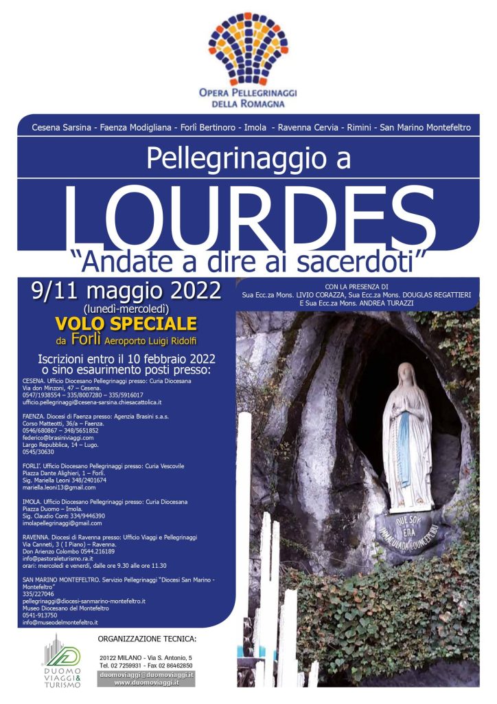 La Diocesi di San Marino-Montefeltro insieme alle Diocesi della Romagna organizza un pellegrinaggio a Lourdes dal 9 all'11 maggio 2022 con volo speciale da Forlì. Accompagnerà i pellegrini il Vescovo Andrea insieme al Vescovo di Forlì-Bertinoro e al Vescovo di Cesena-Sarsina. Iscrizioni entro il 10 febbraio 2022 e sino ad esaurimento posti