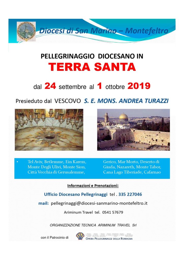 La diocesi di San Marino-Montefeltro organizza dal 24 settembre al 1 ottobre 2019 un pellegrinaggio diocesano in Terra Santa presieduto dal Vescovo Andrea. Per informazioni e prenotazioni: Ufficio Diocesano Pellegrinaggi cell. 335 22746 / email: pellegrinaggio@diocesi-sanmarino-montefeltro.it