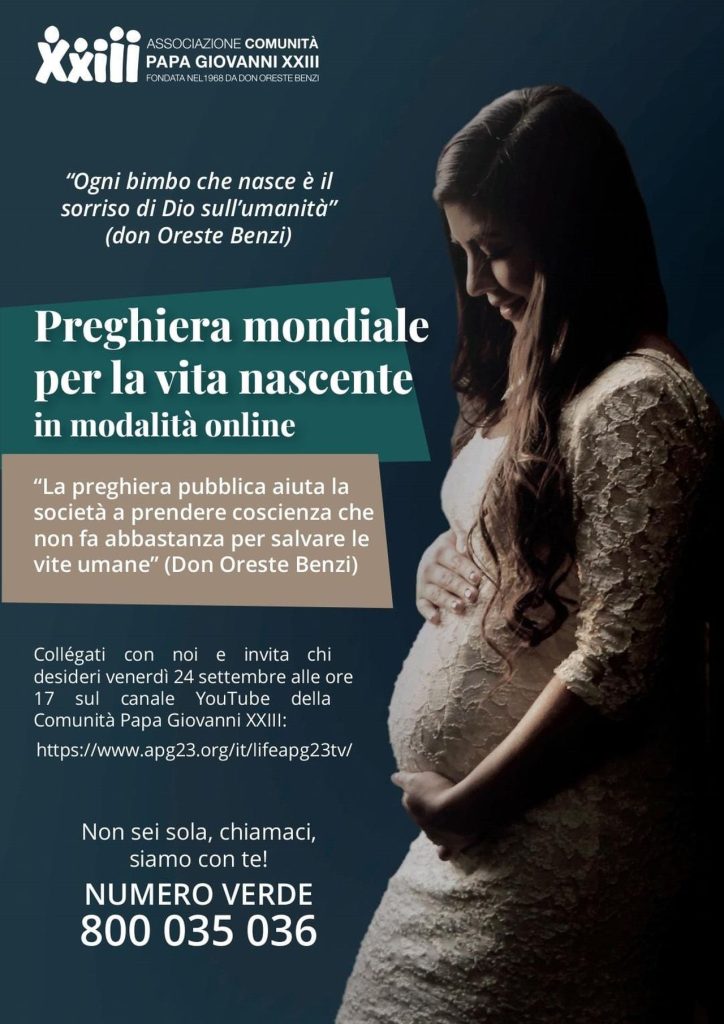 Venerdì 24 settembre alle ore 17 sarà possibile unirsi alla preghiera mondiale del Santo Rosario per la Vita nascente promossa dall'Associazione Papa Giovanni XXIII. La diretta da Rimini sarà fruibile sul canale YouTube dell'Associazione. Parteciperà anche il Vescovo Andrea