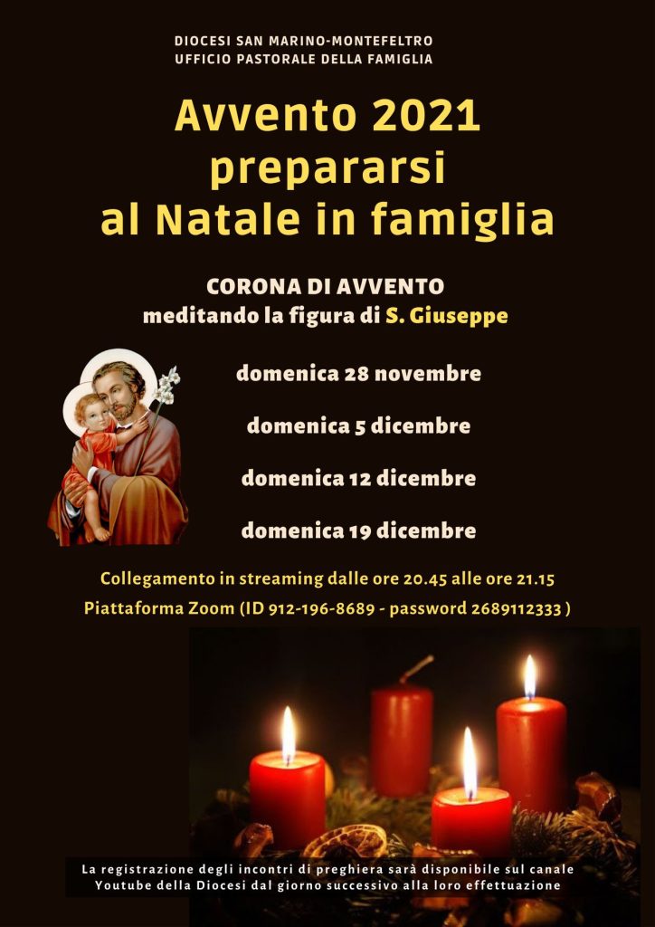 L'Ufficio diocesano per la famiglia organizza la "Corona di Avvento" per prepararsi al Natale in famiglia: ogni domenica dalle ore 20:45 alle 21:15 meditando la figura di San Giuseppe, in quest'anno a lui dedicato, in collegamento dalle proprie case su piattaforma ZOOM