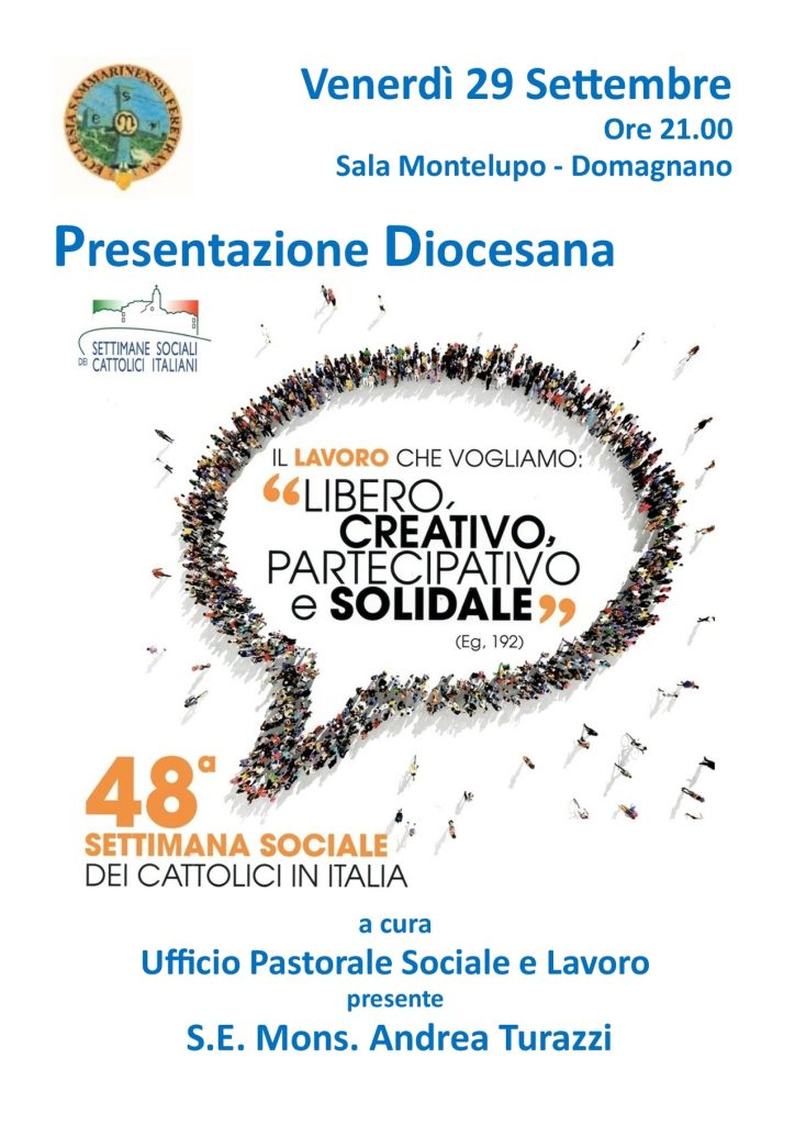 Venerdì 29 settembre alle ore 21 presso la Sala Montelupo a Domagnano (RSM) si terrà la presentazione diocesana della 48° Settimana Sociale dei Cattolici in Italia. Sarà presente il vescovo Andrea insieme ai delegati diocesani