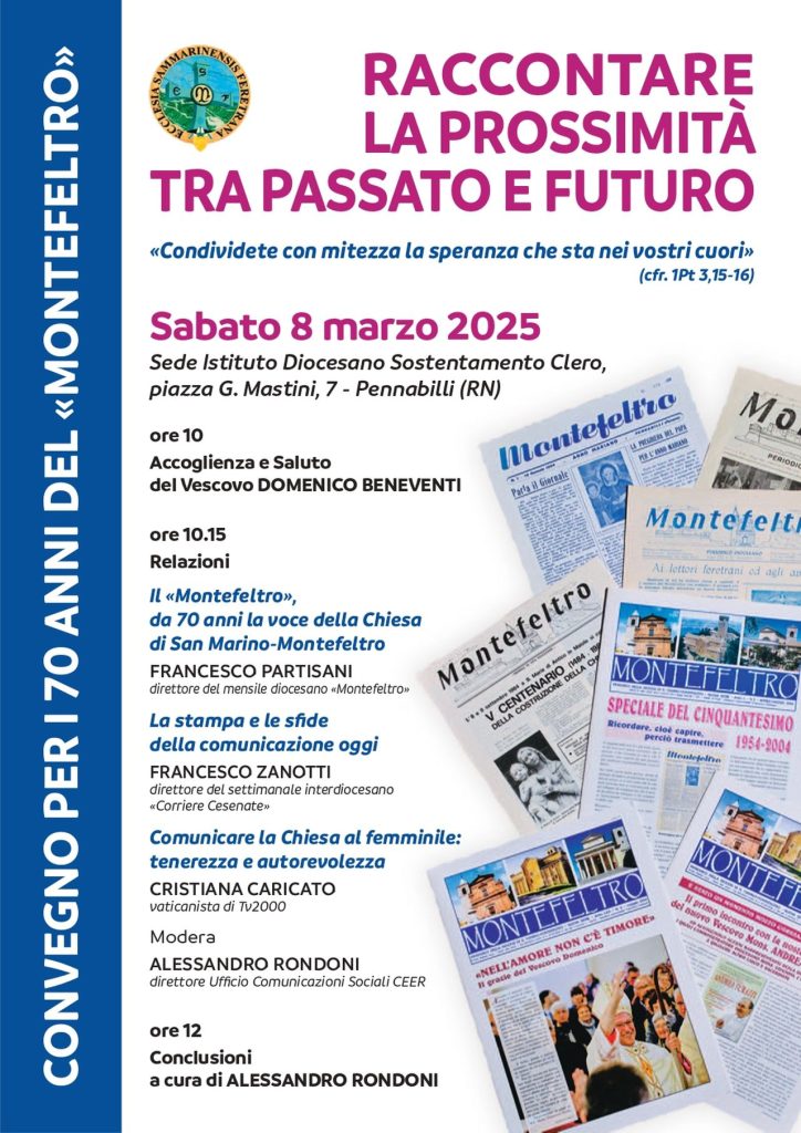 In questo inizio anno la Chiesa di San Marino-Montefeltro, con gratitudine ed entusiasmo, annuncia la celebrazione del 70° anniversario della rivista diocesana “Montefeltro”, da poco rinnovata nella grafica e nello stile. L’anniversario sarà festeggiato con un Convegno che si terrà sabato 8 marzo presso Palazzo Carboni, sede dell’Istituto Diocesano Sostentamento Clero, piazza G. Mastini, 7 – Pennabilli (RN).