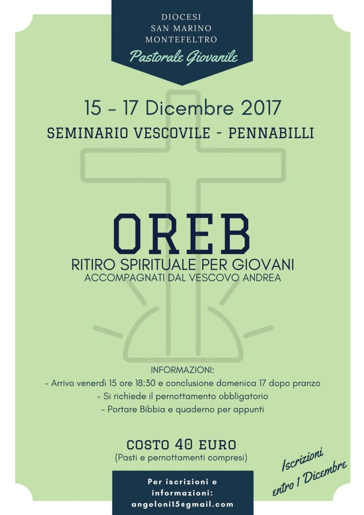Dal 15 al 17 dicembre presso il Seminario di Pennabilli si terrà un ritiro spirituale per giovani dal titolo: "Oreb". Le meditazioni saranno tenute dal Vescovo Andrea. Iscrizioni entro il 1 dicembre