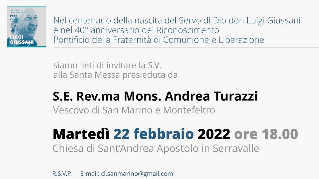 Martedì 22 febbraio alle ore 18 la Fraternità di Comunione e Liberazione festeggia un anniversario molto significativo con una S.Messa presieduta dal Vescovo Andrea presso la parrocchia di Serravalle (RSM)