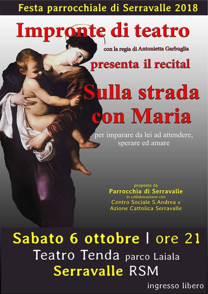 Sabato 6 ottobre alle ore 21 presso il Teatro Tenda (Parco Laiala) la parrocchia di Serravalle in collaborazione con il Centro Sant'Andrea e l'Azione Cattolica di Serravalle, durante la festa dedicata alla Madonna del Rosario, propongono il Recital dal titolo: «Sulla strada con Maria», regia di Antonietta Garbuglia
