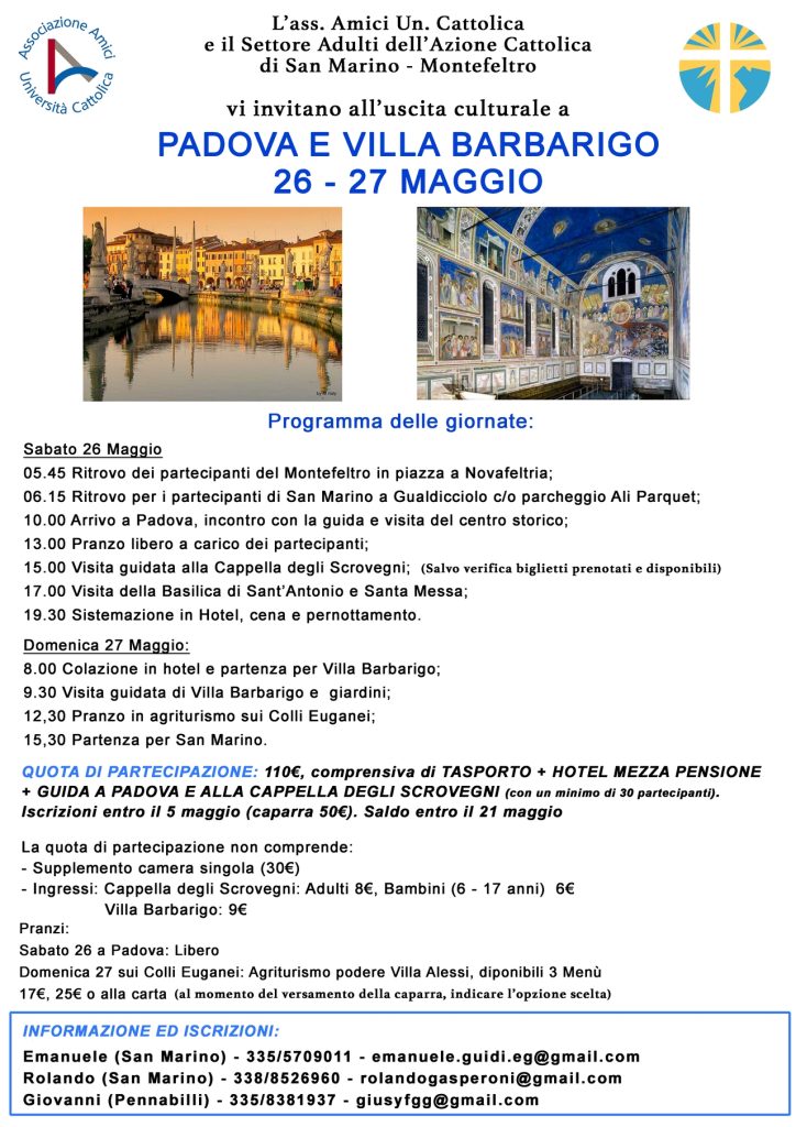 Sabato 26 e domenica 27 maggio USCITA CULTURALE a PADOVA organizzata dall'Associazione Amici dell'Università Cattolica e dall'Azione Cattolica Adulti. Iscrizioni entro il 5 maggio. Saldo entro il 21 maggio.