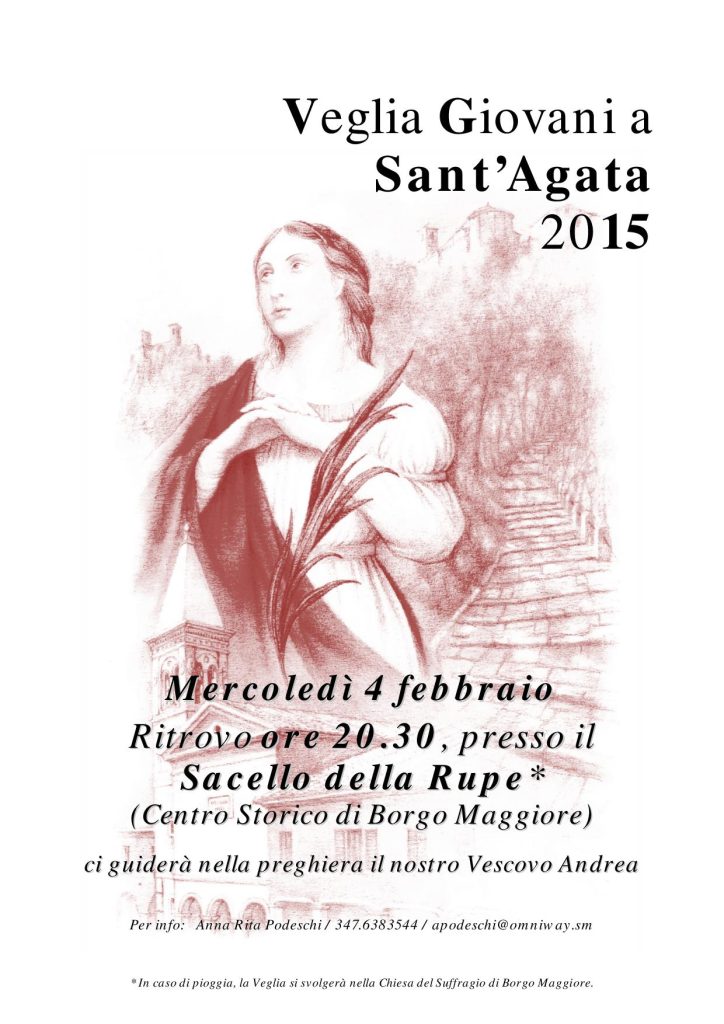 Mercoledì 4 febbraio alle ore 20.30 ritrovo presso il Sacello della Rupe (Borgo Maggiore, RSM). Guiderà nella preghiera il vescovo Andrea