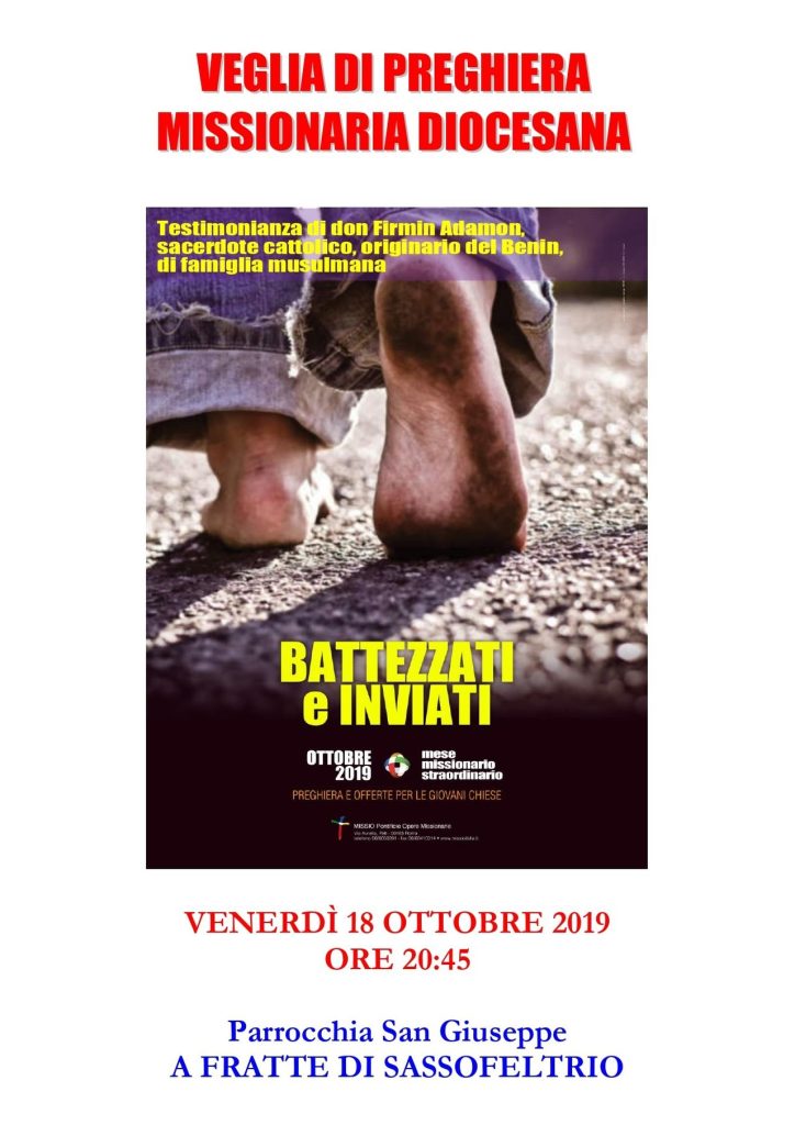 Venerdì 18 ottobre nella chiesa parrocchiale di Fratte di Sassofeltrio ci sarà una veglia di preghiera missionaria diocesana, con la testimonianza di don Firmin Adamon, sacerdote cattolico, originario del Benin, proveniente da famiglia musulmana. Domenica 20 ottobre la Giornata Missionaria Mondiale verrà celebrata con particolare solennità in ogni parrocchia