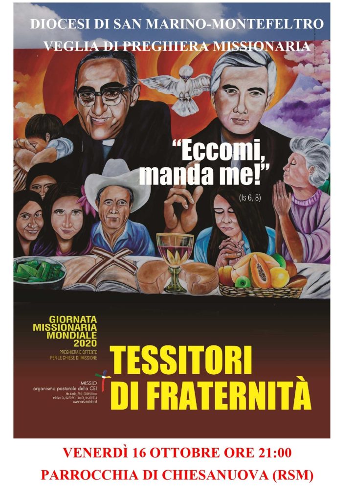 Venerdì 16 ottobre alle ore 21 si terrà la VEGLIA MISSIONARIA DIOCESANA presso la chiesa parrocchiale di Chiesanuova (RSM). "In questo anno, segnato dalle sofferenze e dalle sfide procurate dalla pandemia da covid 19, il cammino missionario di tutta la Chiesa prosegue alla luce della parola che troviamo nel racconto della vocazione del profeta Isaia: «Eccomi, manda me» (Is 6,8). È la risposta sempre nuova alla domanda del Signore: «Chi manderò?» (ibid.). Questa chiamata proviene dal cuore di Dio, dalla sua misericordia che interpella sia la Chiesa sia l’umanità nell’attuale crisi mondiale" (Papa Francesco).