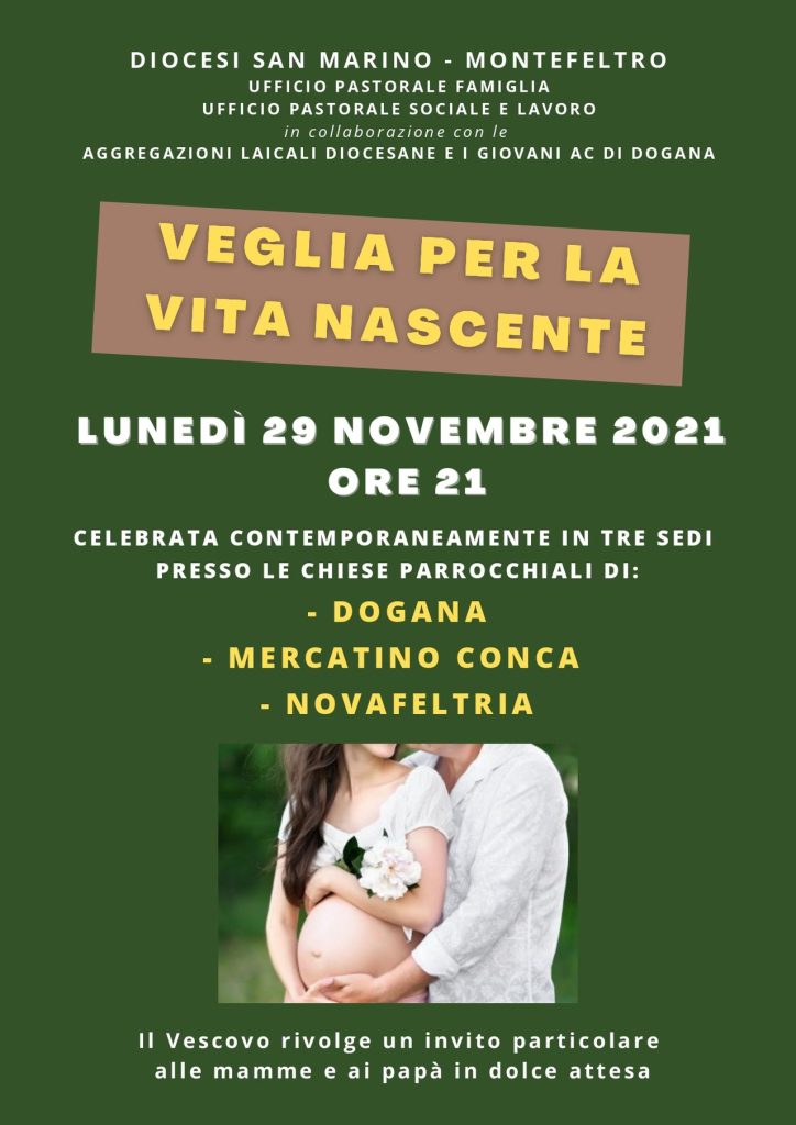 Venerdì 29 novembre alle ore 21, celebrata contemporaneamente nei tre vicariati, rispettivamente a Dogana (RSM), Mercatino Conca, Novafeltria, si terrà la VEGLIA DI PREGHIERA PER LA VITA NASCENTE. Il Vescovo rivolge un invito particolare alle mamme e ai papà in dolce attesa. La Veglia è organizzata dagli Uffici diocesani per la Famiglia e per la Pastorale Sociale in collaborazione con le Aggregazioni laicali e i Giovani AC di Dogana