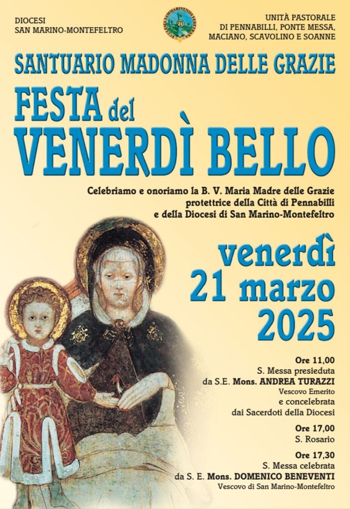 Venerdì 21 marzo, terzo venerdì del mese, a Pennabilli si celebra l’anniversario della lacrimazione della Madonna delle Grazie, protettrice di Pennabilli e della Diocesi di San Marino-Montefeltro.