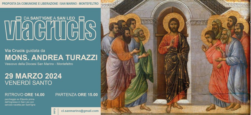 Venerdì Santo, 29 marzo, alle ore 15 si terrà la tradizionale Via Crucis da Sant'Igne a San Leo organizzata da Comunione e Liberazione e guidata dal Vescovo, mons. Andrea Turazzi. E' previsto un servizio navetta per Sant'Igne dal parcheggio dell'ex Eliporto all'ingresso in San Leo
