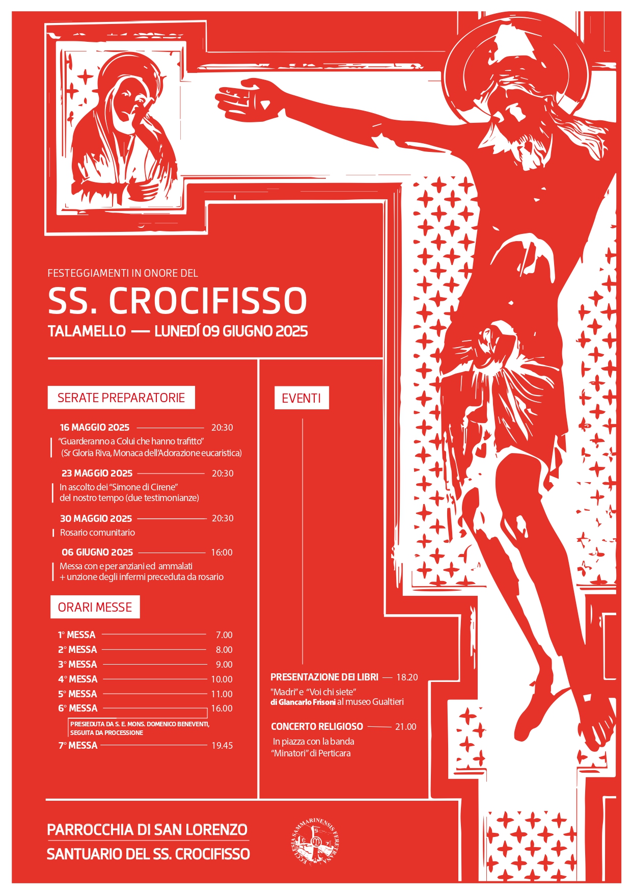 Il lunedì dopo la Pentecoste si celebra la festa del Santissimo Crocifisso di Talamello. Varie celebrazioni eucaristiche scandiscono la giornata, dalle 7 del mattino fino alle 19.45; la Messa delle ore 16, presieduta dal Vescovo, sarà seguita dalla processione. Agli eventi religiosi si aggiungono due attività: la presentazione, alle ore 18.20 al Museo Gualtieri, di “Madri” e “Voi chi siete”, due libri scritti da Giancarlo Frisoni; ed anche il concerto religioso in Piazza G. Garibaldi con la Banda “Minatori” di Perticara.