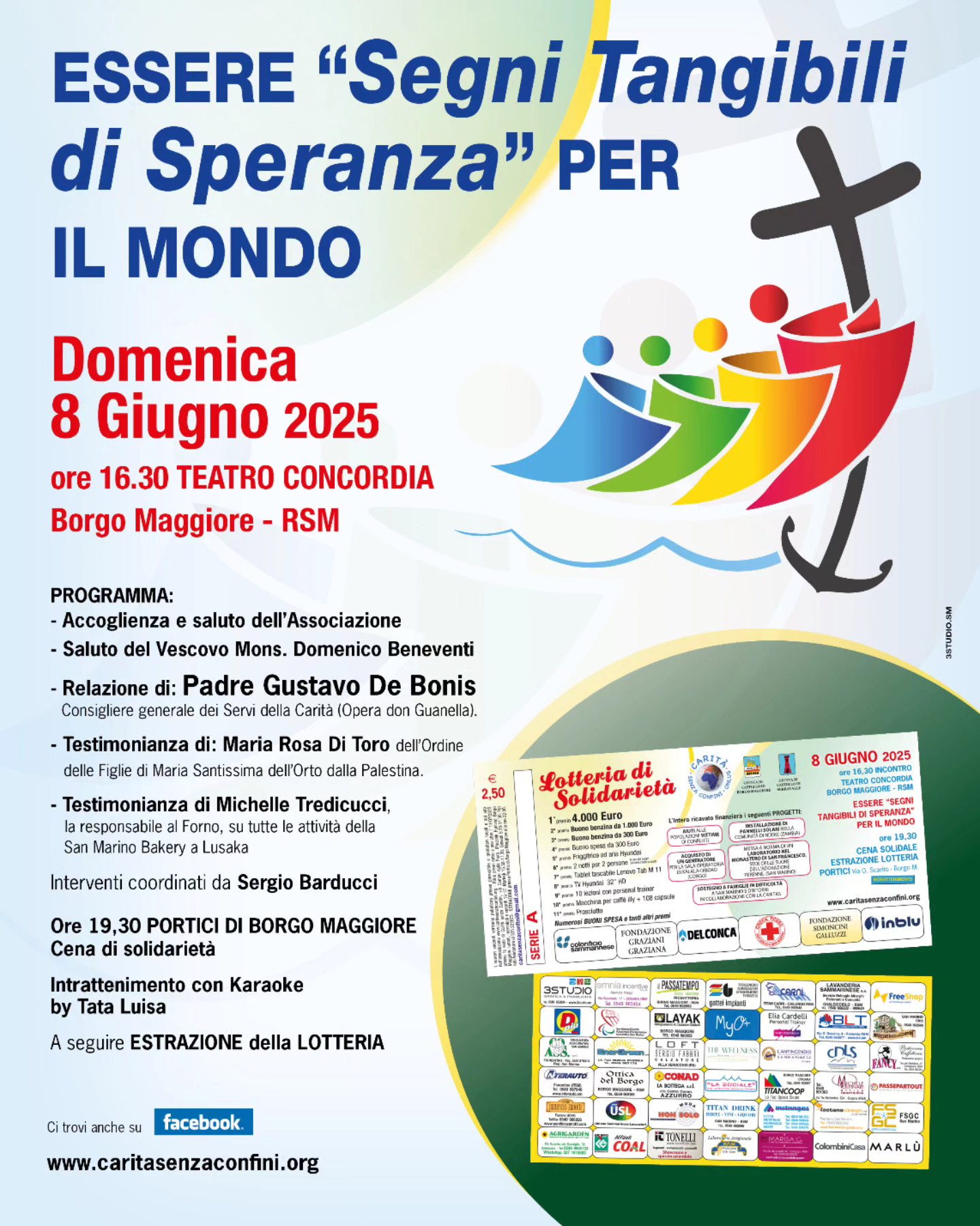 ll titolo di questa edizione è: Essere “segni tangibili di speranza” per il mondo. Il tema vuole richiamare il messaggio centrale del Giubileo 2025 cioè la speranza, declinata nei tanti e diversi segni concreti che gli esseri umani compiono, magari silenziosamente, in nome della Carità. Relatore: Padre Gustavo De Bonis, Consigliere Generale dei Servi della Carità (Opera Don Guanella). Testimonianza di Sr Maria Rosa dell’Ordine delle Figlie di Maria Santissima dell’Orto dalla Palestina.